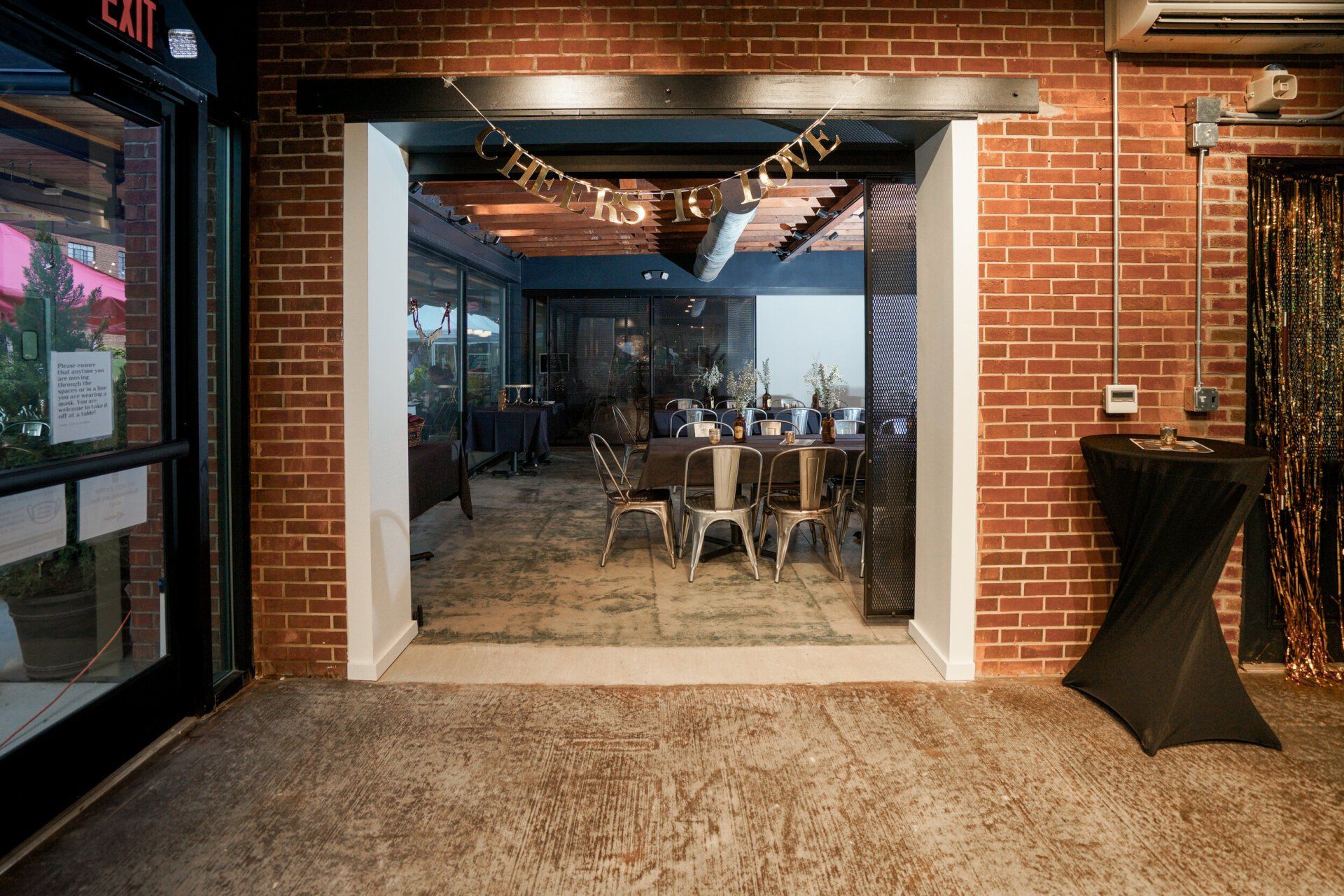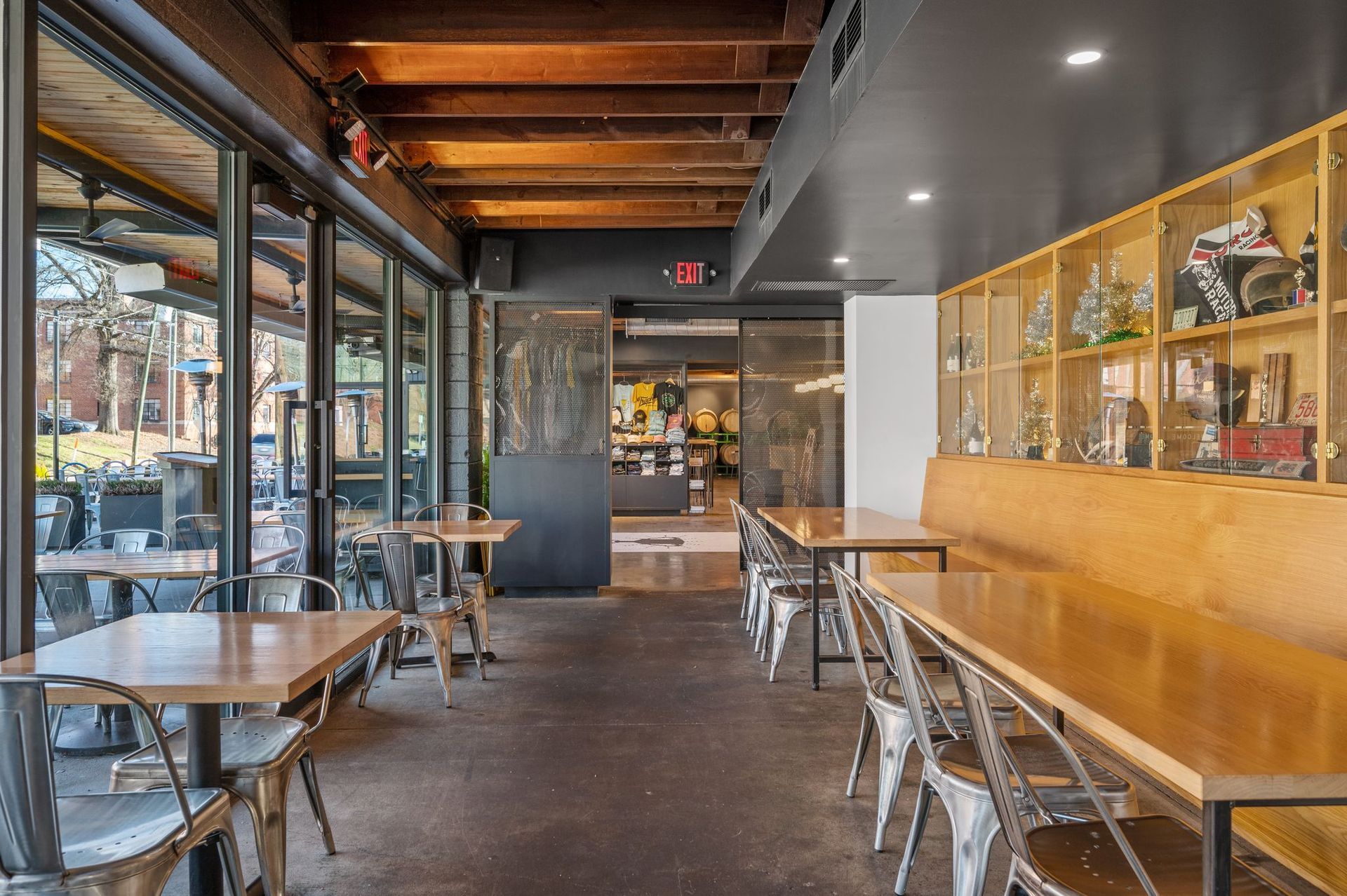 This location leans into an industrial aesthetic with concrete floors, exposed brick and beams, and glass walls. The patio features green spaces maintained by Good Dirt and string lighting overheard which add to the ambience throughout the restaurant. Our furniture features custom built tables from Rebuild Raleigh with bright oak tabletops with silver metal chairs that can be rearranged to fit your needs.