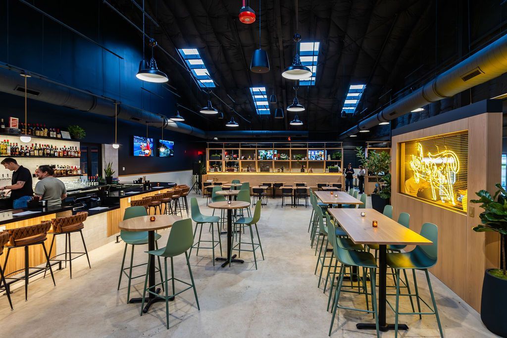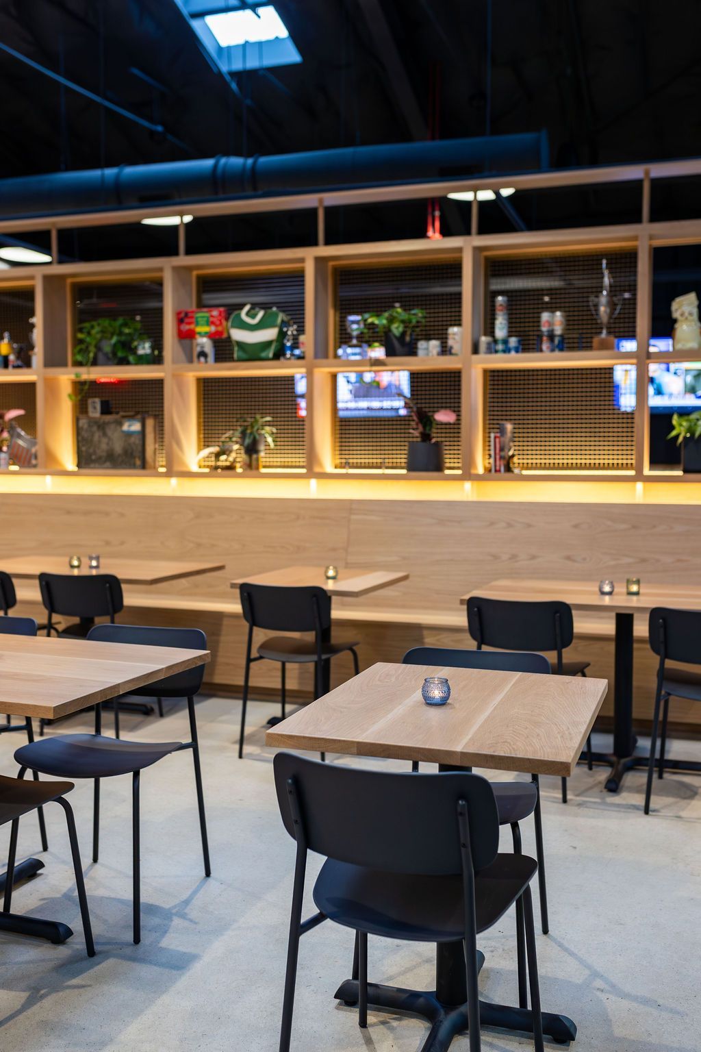 This location seeks to pay homage to the original structure, leaning into an industrial aesthetic, while also creating a warm environment characterized by concrete floors, exposed brick and beams, and glass walls. Our furniture features custom-built tables and feature walls from Rebuild Raleigh with bright oak tabletops.